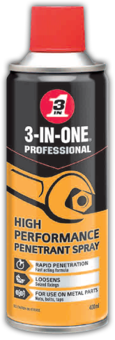 The fast-acting formula of 3-IN-ONE professional High Performance Penetrant spray loosens rusted or stuck parts, and works to remove grease and grime from a variety of surfaces. It also helps prevent rust and corrosion.