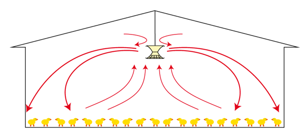 V-Flo Fan - Single Phase - For a uniform development of the animals, it is important to distribute the heat optimally in the poultry house. The V-FloFan from Vostermans Ventilation offers the possibility to reduce the negative impacts of temperature differences in the poultry house at an energy efficient way. Through vertical ventilation the heat is distributed to lower levels in the poultry house, resulting into an optimal microclimate on animal level.