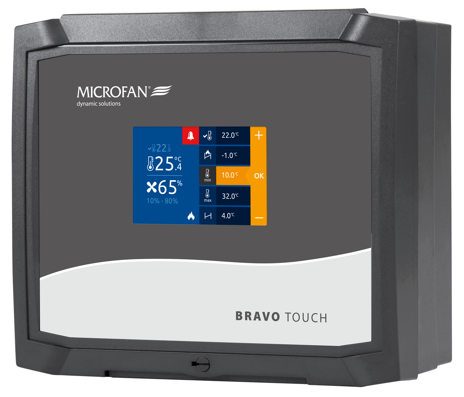 Bravo Touch Control Climate Controller with 10A output with network connection The new generation BRAVO TOUCH, equipped with a touch screen and remote connectivity (optional, to be purchased separately), can be perfectly applied to all types of ventilation and heating or cooling purposes in today’s livestock industry. BRAVO TOUCH combines climate control with ease and simplicity.